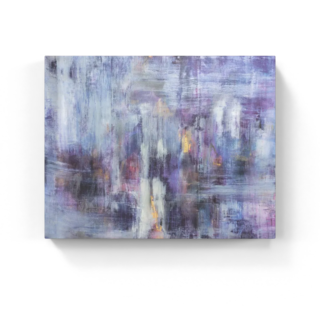 This artwork interprets abstract cityscape art through atmosphere rather than structure. Veils of violet and indigo drift across the surface, interrupted by soft glows of pale gold that recall city lights blurred by fog or rain. The composition favors emotion over geography. Creating a sense of scale, distance, and quiet intensity that feels both intimate and expansive.