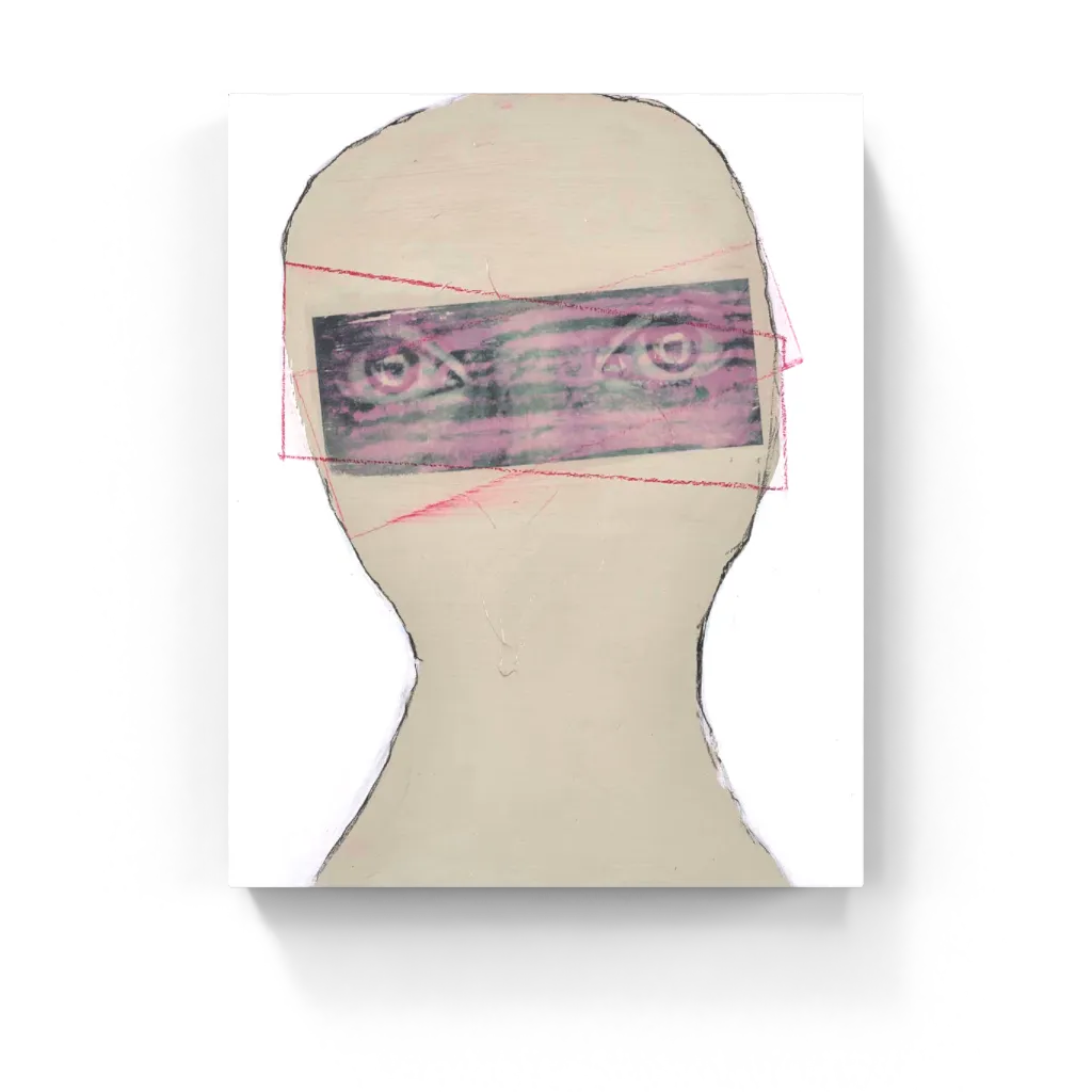 A faceless figure stares with distorted eyes framed in a violet haze, embedded within raw layers of beige and white. This mixed-media portrait is haunting and stripped—part identity, part erasure, all gaze.