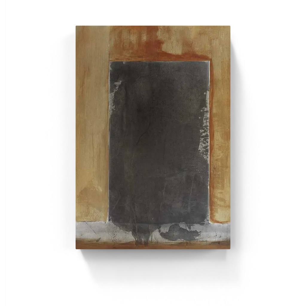 Oxidized Harmony I is a raw abstract piece featuring a bold black slab framed by scorched sienna and muted ochre. Minimalist, textured, and industrial—where decay meets design.