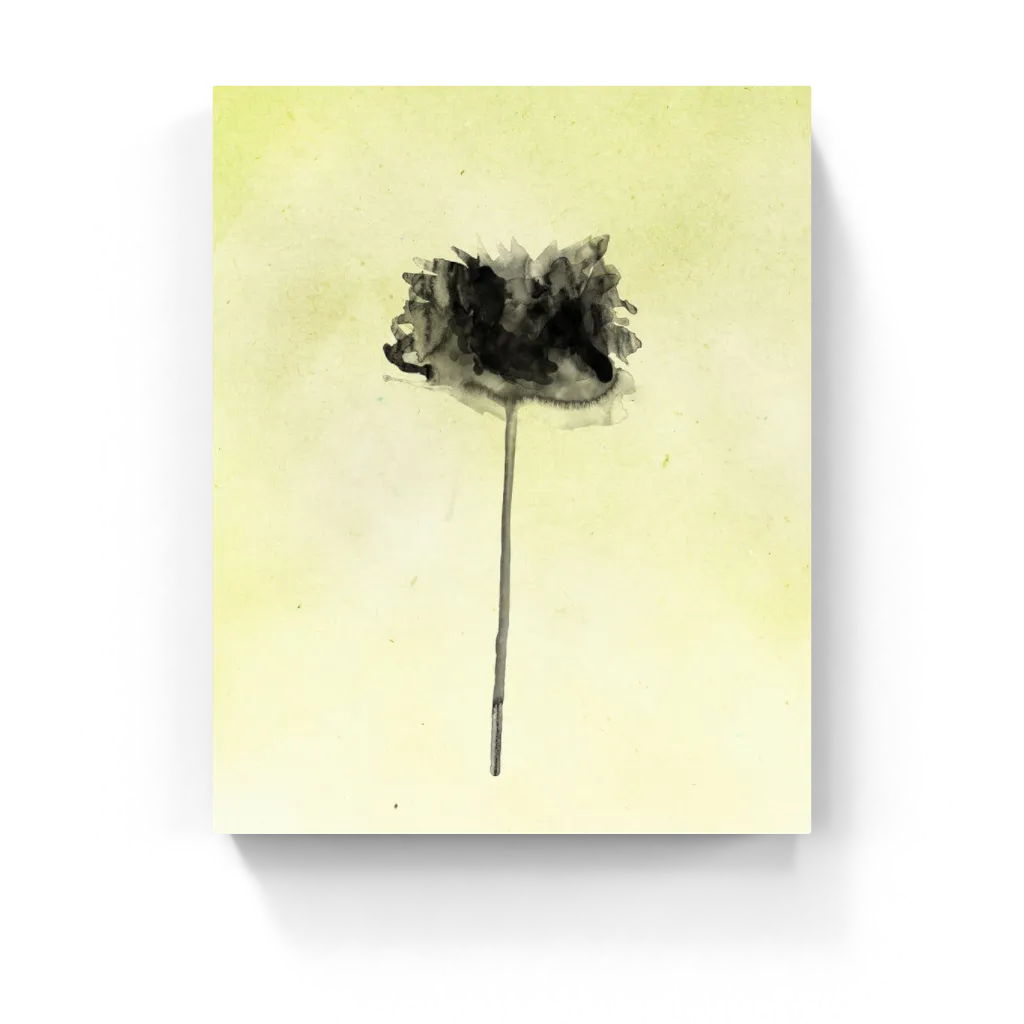 Minimalistic watercolor ink painting of a single abstract flower rendered in delicate black brush strokes against a soft, pale green background, capturing serene simplicity and subtle elegance.
