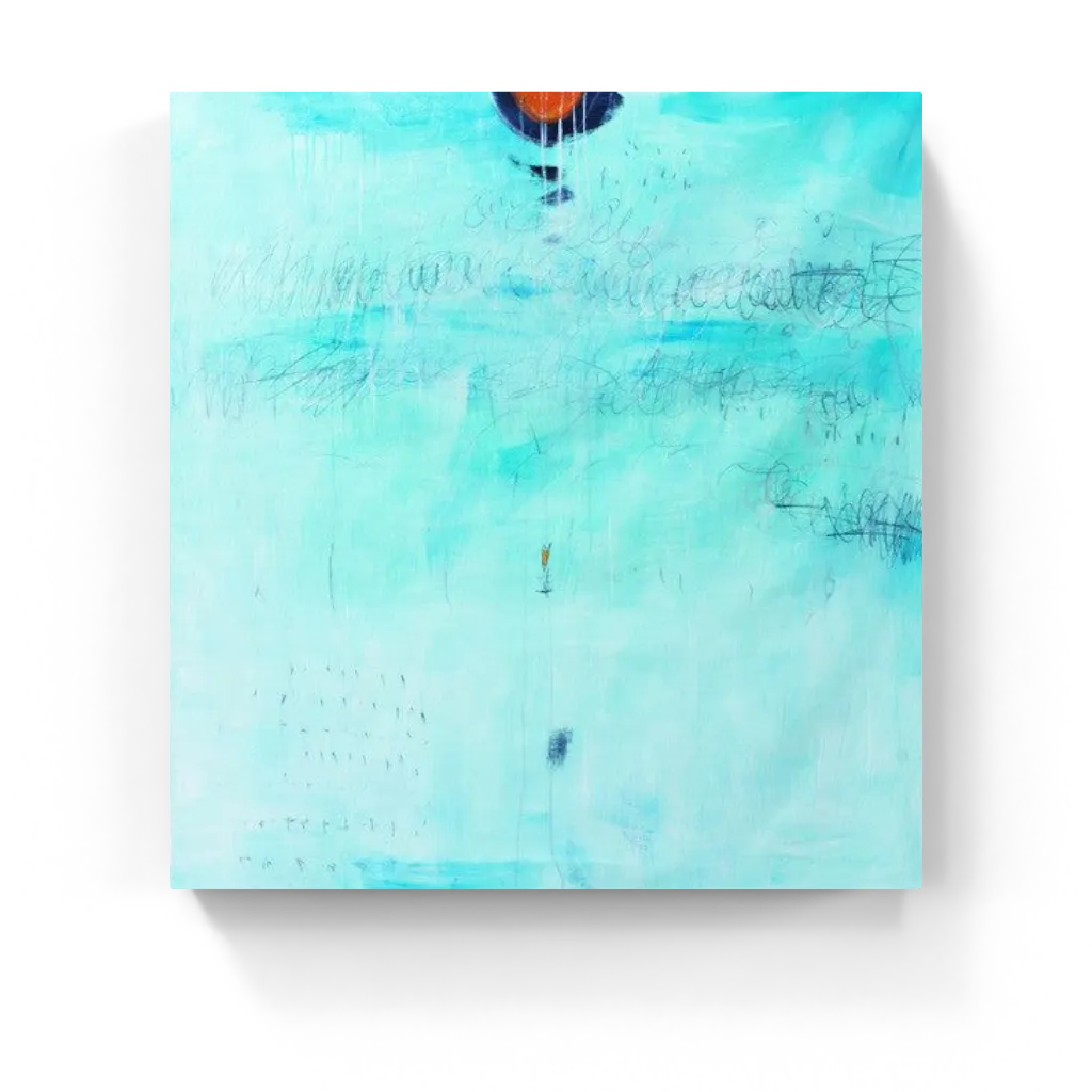 Expressive abstract painting in soothing shades of turquoise and aqua, accented by energetic scribbles and a bold orange focal point, blending emotional depth with contemporary minimalism.