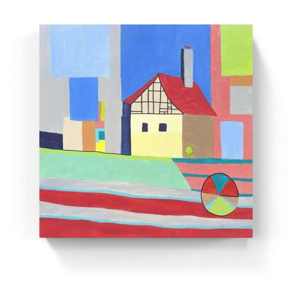 This playful geometric painting features a quaint cottage at the heart of a bold village scene. Blocks of sky and land frame the composition, while a rainbow-striped ball adds a whimsical accent, making it a charming statement for modern interiors.