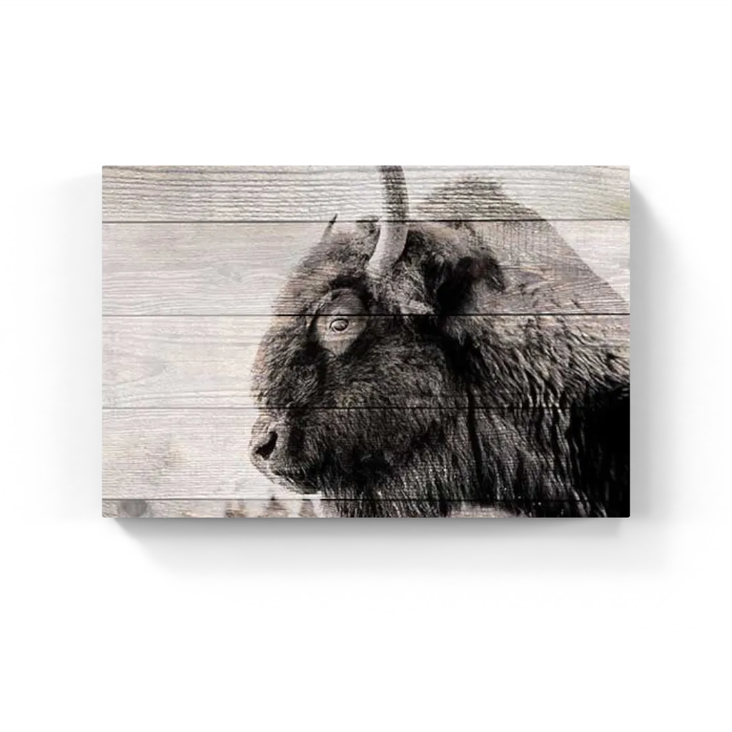 A stately bison gazes outward, its form etched in soft grayscale against the horizontal grain of weathered wood planks—this rustic image blends natural majesty with a handcrafted, vintage feel.