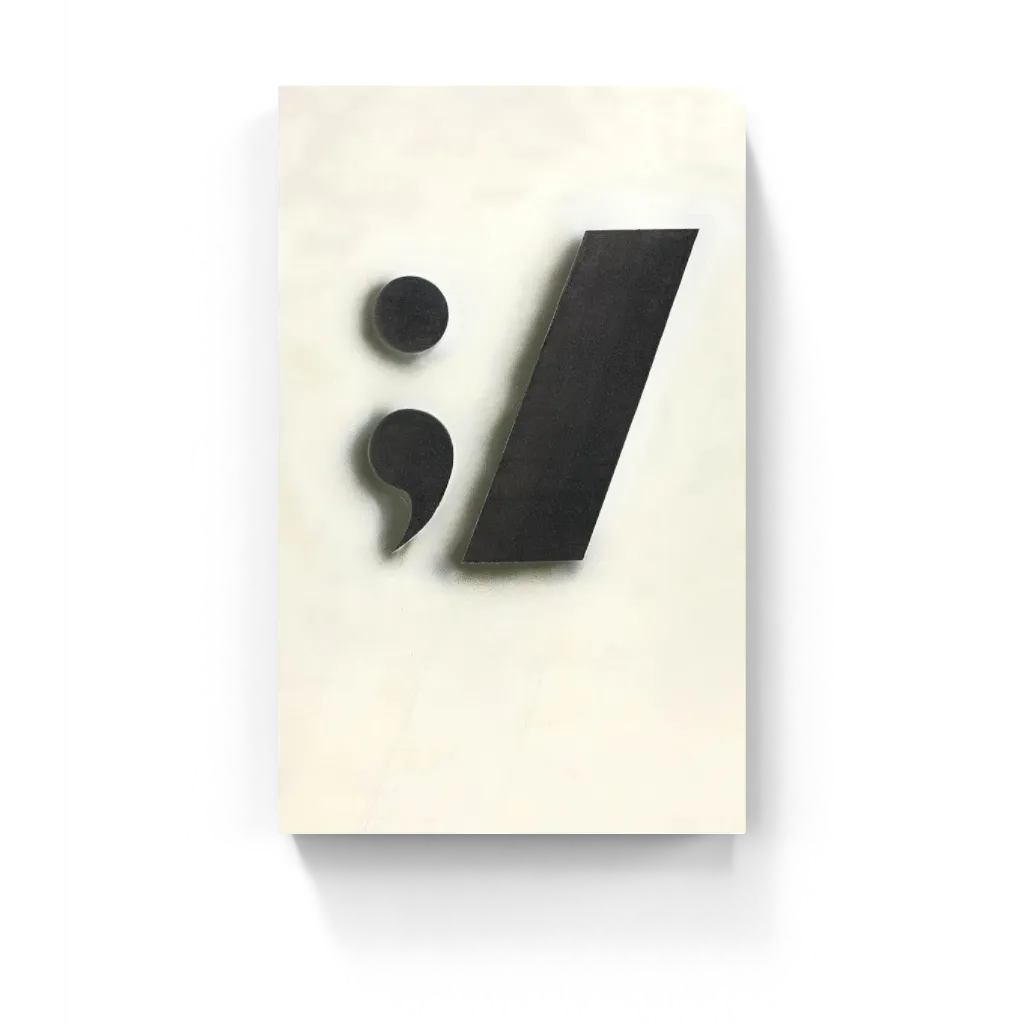 A bold semicolon and slash rendered in solid black shapes dominate a pale, silent field. This conceptual minimalist art distills language into form—pause, break, forward—transforming punctuation into a sculptural code of rhythm and intent.