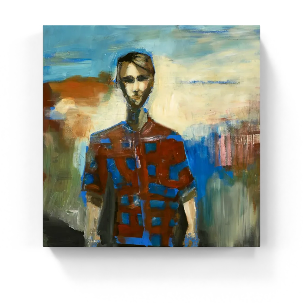 This expressive figurative painting portrays an abstracted male figure in red, blue, and earthy hues. The loose brushstrokes combined with a soft, blurred background creates movement and introspection. It captures the deep emotion with modern energy.