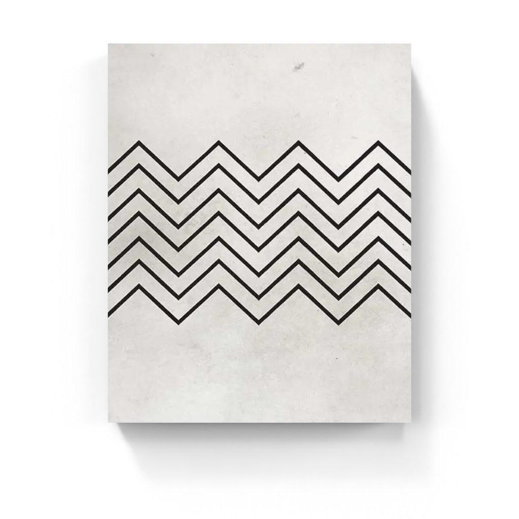 A series of bold zigzag lines ripple across a textured white background—geometric yet rhythmic, this minimalist composition echoes waves, vibration, or coded sound.