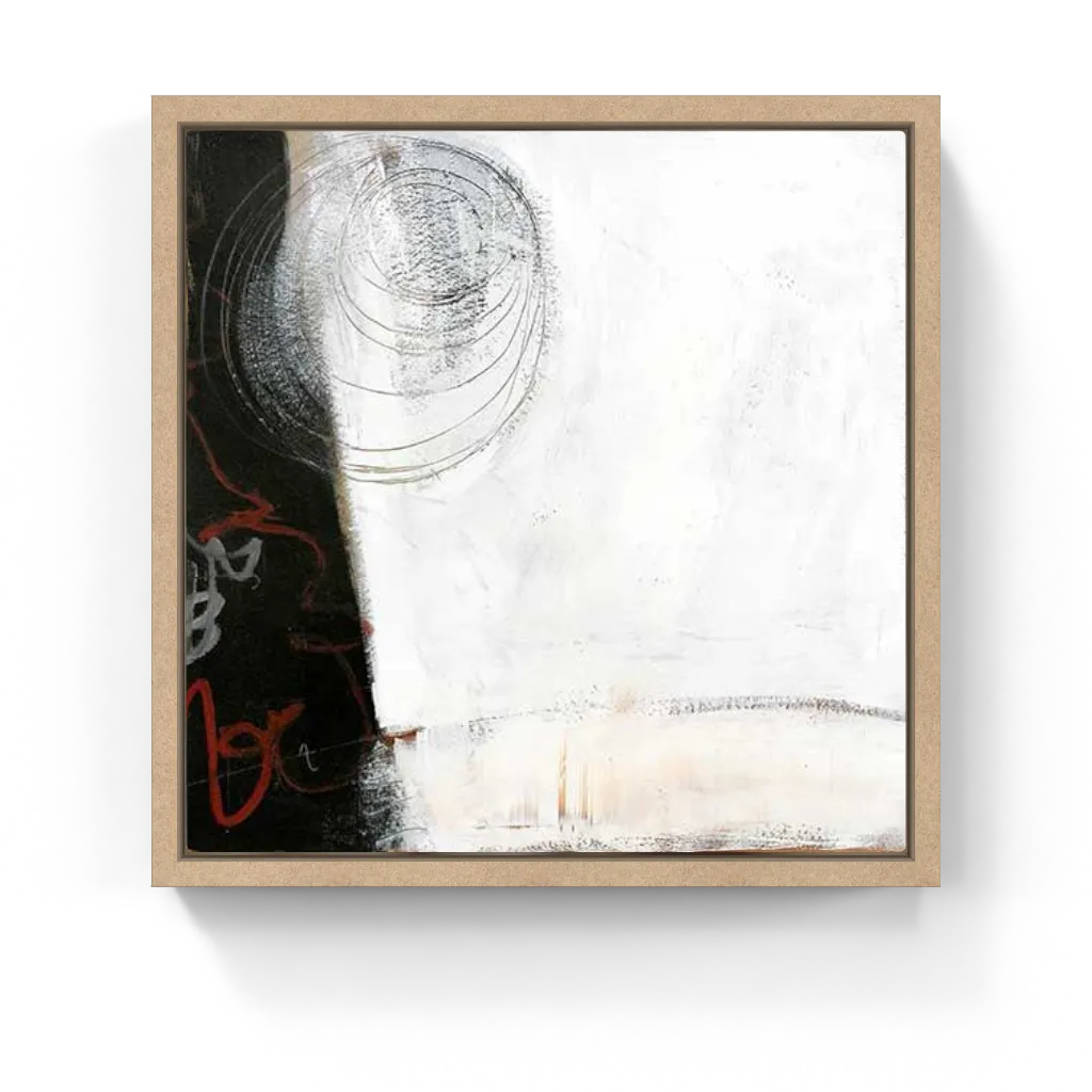 A dramatic, abstract piece with swirling circular shapes and bold brushstrokes against a deep black background. The contrast of red and white marks adds energy and depth, inviting introspection and exploration.