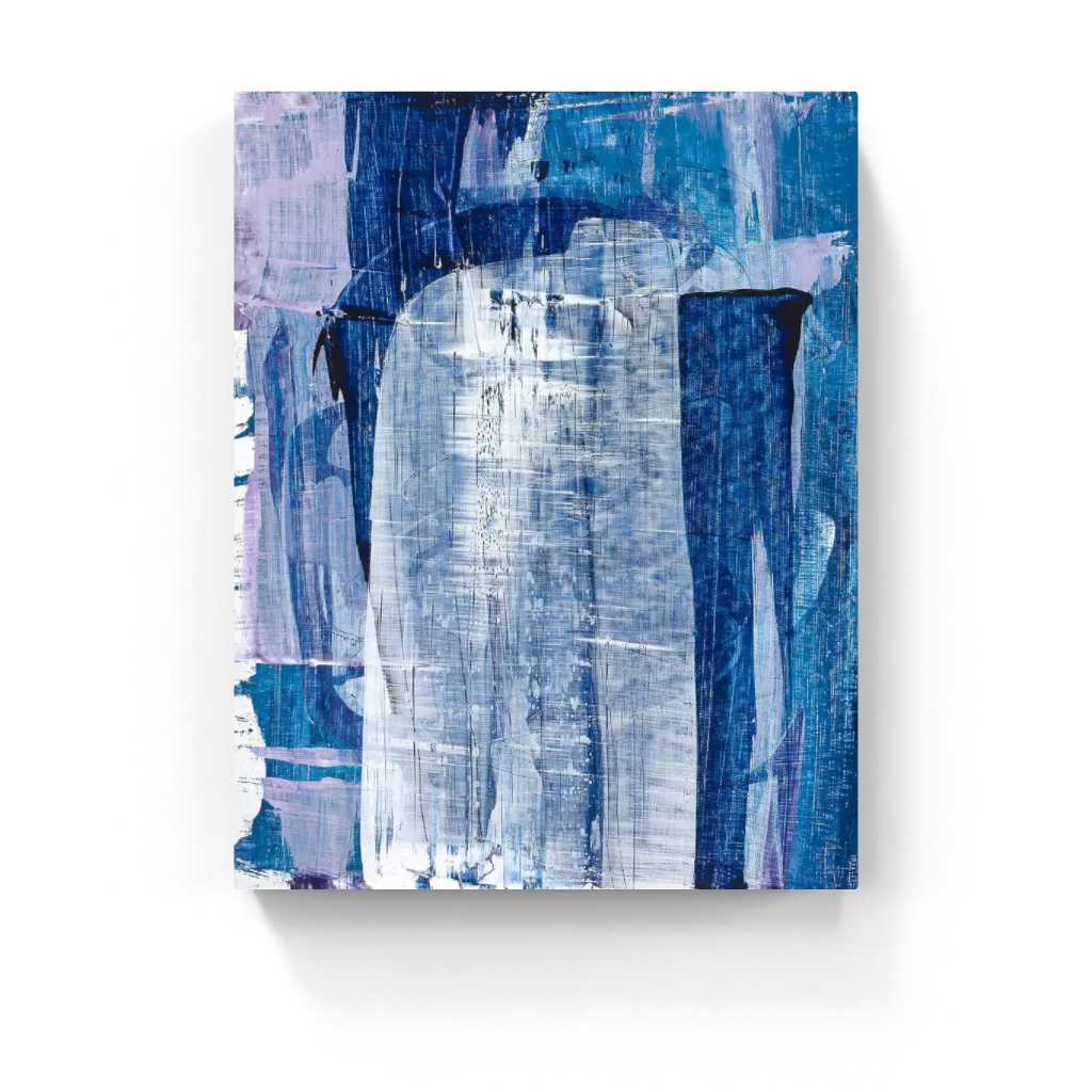 A rich abstract in layered blues, purples, and icy whites. Vertical strokes and dragged textures create a sense of depth and suspended motion, like figures floating in a dream.