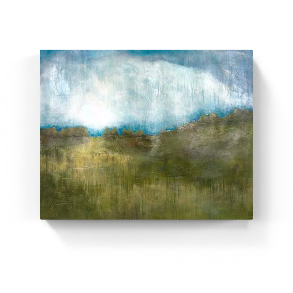 A glowing horizon cuts through softened greens and weathered textures. Light rising from the land like a memory coming back into focus. Dreamlike yet grounded, this glowing horizon abstract landscape carries a timeless sense of calm and quiet depth. Perfect for interiors that want to embrace atmosphere, subtle drama, and organic warmth.