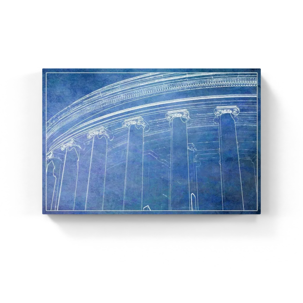 Artistic blueprint-style illustration of classical columns from the Jefferson Memorial, elegantly sketched in luminous white against a textured, deep blue background, evoking architectural grandeur.