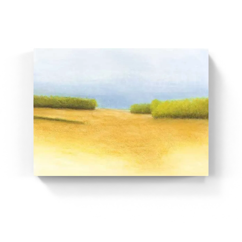 Experience calm serenity with this contemporary landscape painting, featuring expansive golden fields gently bordered by soft green trees beneath tranquil blue skies, evoking peaceful solitude and natural beauty.
