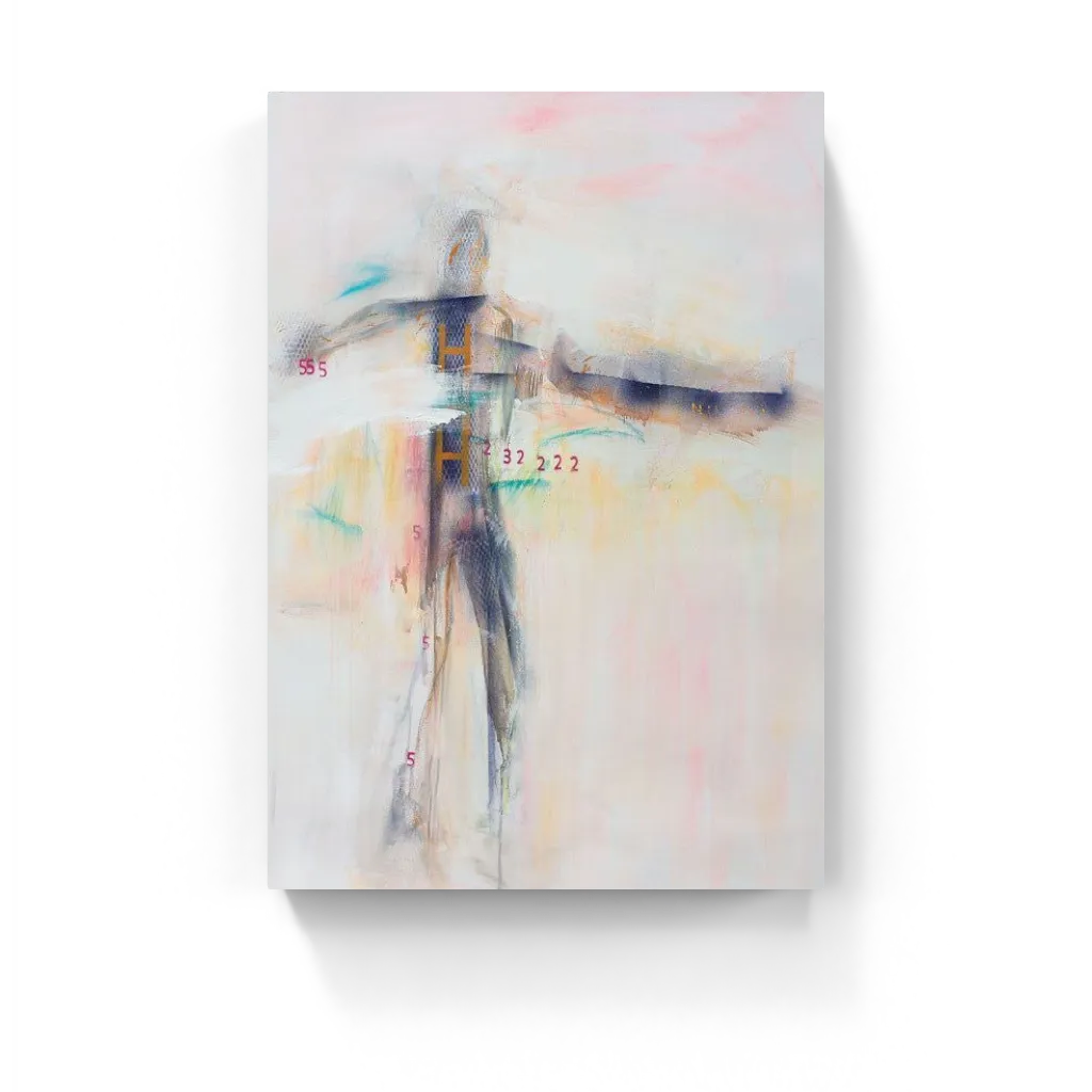 A mixed media piece featuring a solitary figure in a bowler hat, standing over layered text and muted tones. Bold shadow, wire-like lines, and fragmented lettering evoke themes of identity and control.