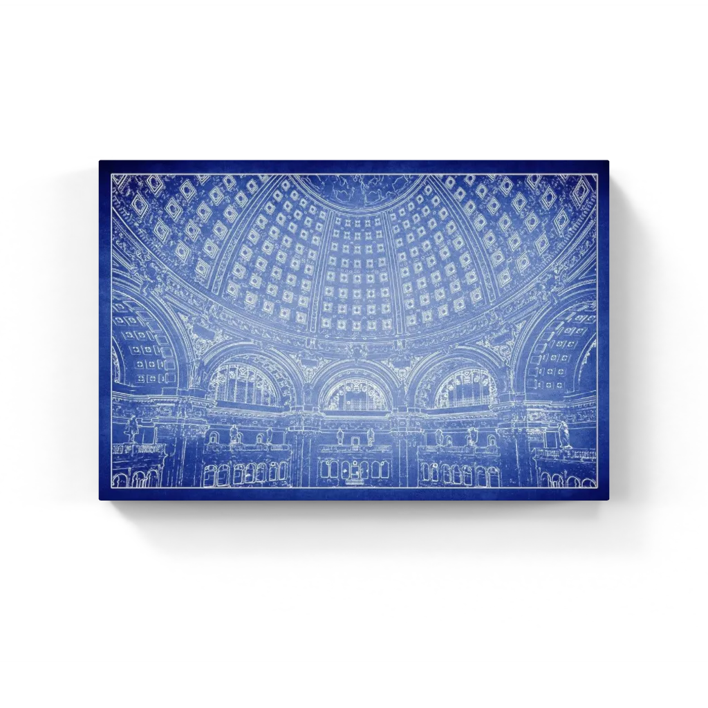 Detailed blueprint-style artwork highlighting the majestic dome and intricate architectural details of the Library of Congress, presented in crisp white lines against a rich, textured blue background, capturing classical sophistication.