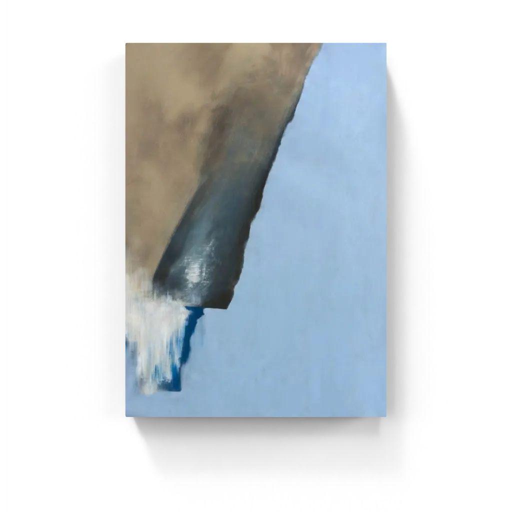 “Living in Exile” evokes isolation and edge—an abstract mass of earthy brown and dusky blue looms against a vast pale backdrop, like a cliff dissolving into sky.