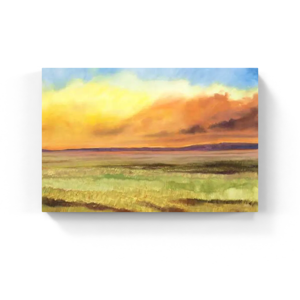 Warm landscape painting featuring a sweeping open field under a vibrant, melon-hued sky. Rich yellows, oranges, and soft greens evoke a serene sunset atmosphere.