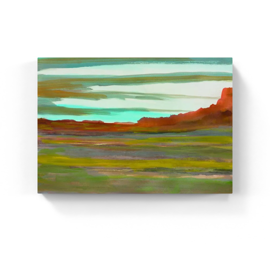 Expansive abstract landscape painting featuring sweeping plains in soft greens and reds, with a glowing sky of warm orange and turquoise streaks, evoking the tranquil beauty of mesa country.