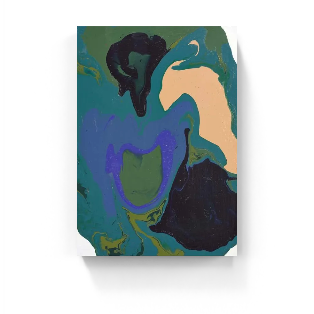 Color melts into color in this fluid abstraction—lush greens, deep blues, and fleshy peach tones swirl like lava caught mid-thought. Smooth, organic shapes twist and pull at the edge of form, dripping with mystery and motion.