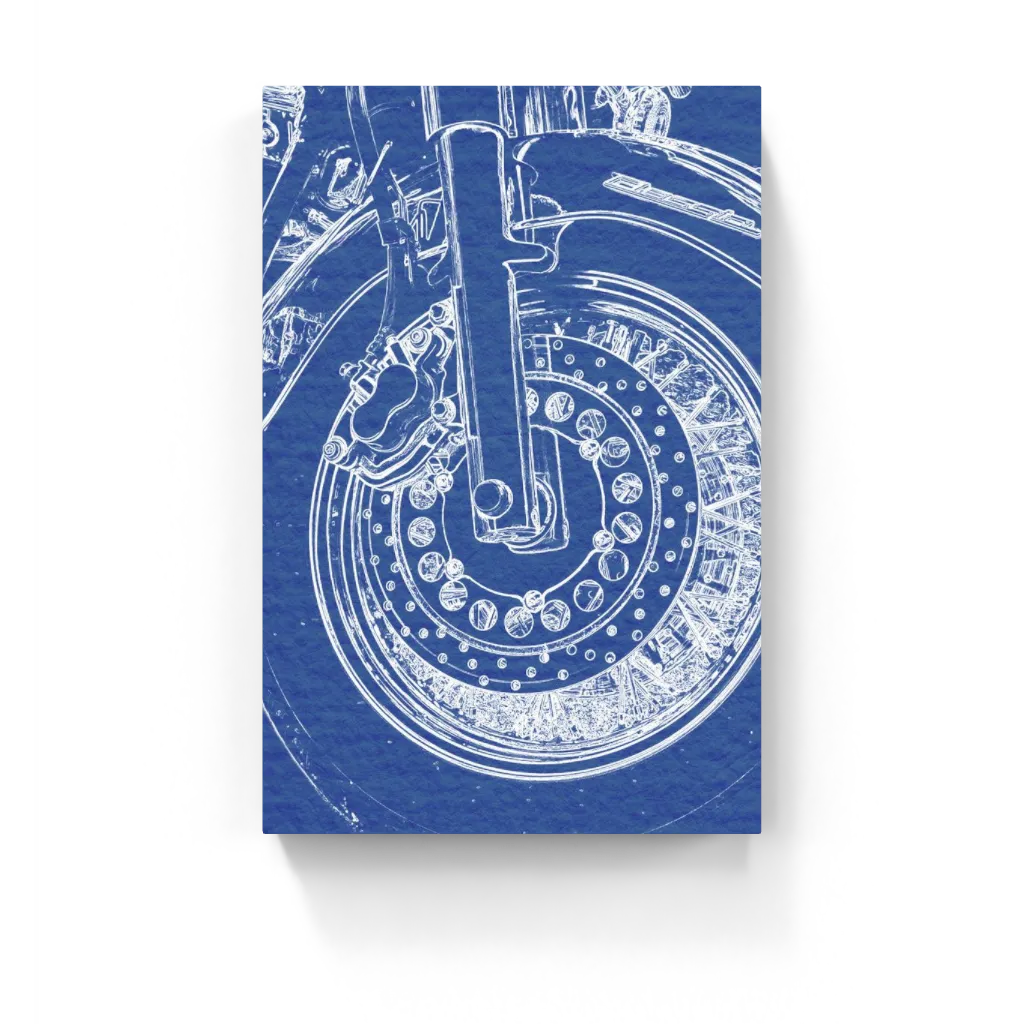 Detailed blueprint-style artwork of a motorcycle wheel and brake assembly, intricately illustrated with precise white linework on a vivid textured blue backdrop, evoking mechanical precision and sleek design.