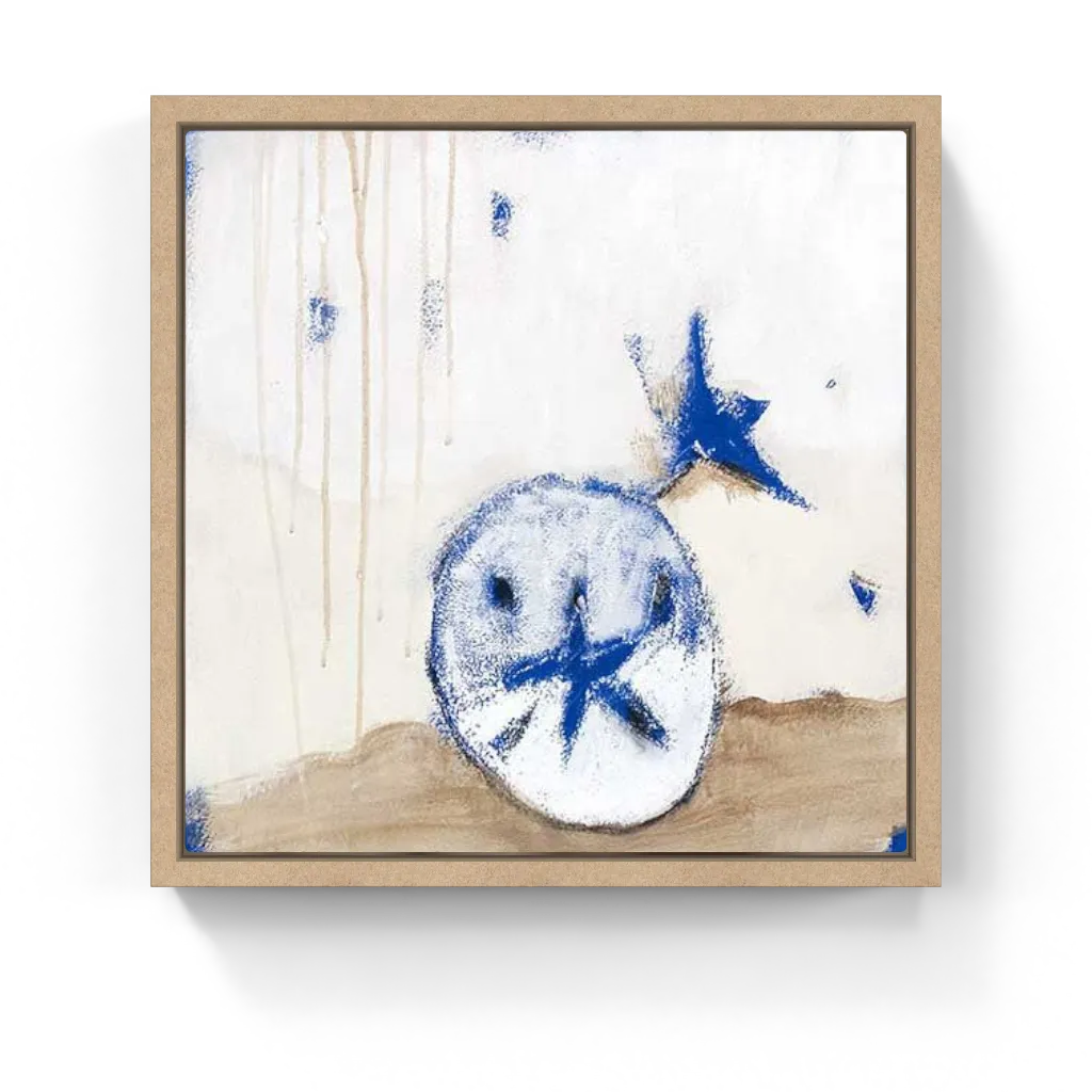 Pansy Shell I blends coastal whimsy with abstract flair—a white sand dollar and cobalt starfish drift across a sandy cream background with sketch-like textures and playful drips.