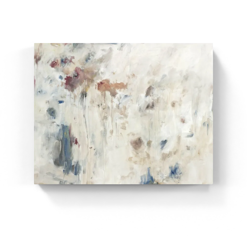 A wash of soft ivory and misty hues, this painting blooms with ephemeral drips and whispers of crimson, peach, and deep blue. An abstract prelude to change—delicate, atmospheric, and hauntingly lyrical.
