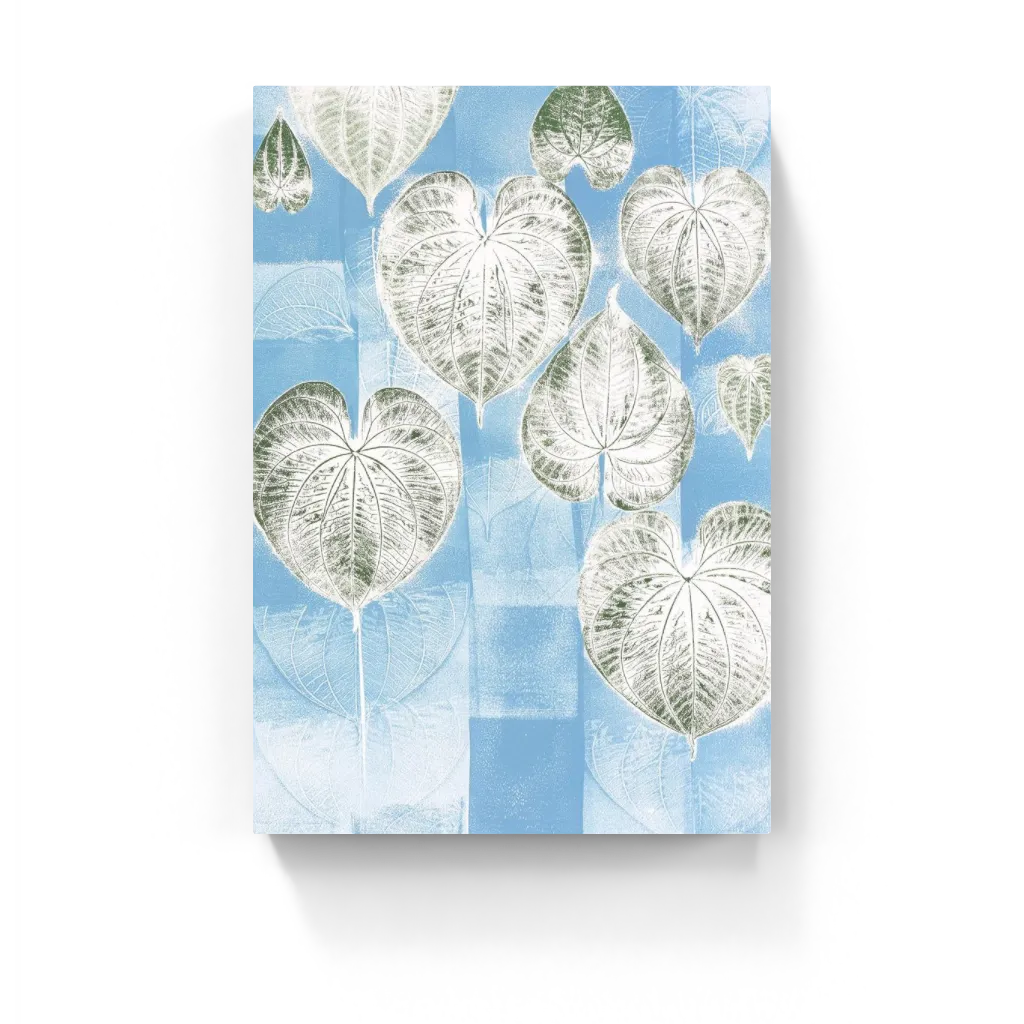"Reductive Folia IV" brings serene nature indoors with delicate green and white leaf impressions over a soft, sky-blue background. This botanical artwork effortlessly combines modern aesthetics and organic beauty.