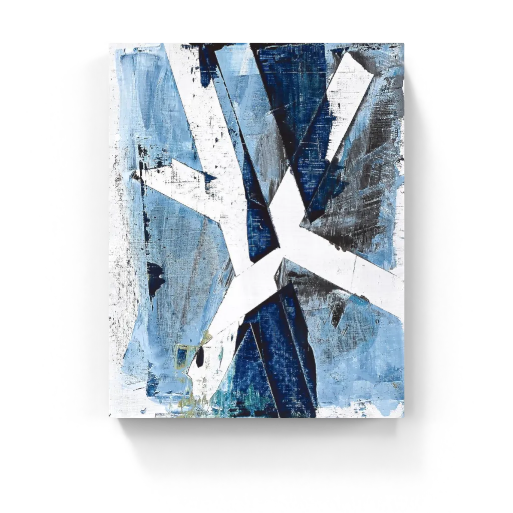 "Scatter Signs I" is a striking abstract composition defined by bold geometric shapes, textured brushstrokes, and intense contrasts of deep indigo and stark white. Energetic and modern, it commands attention through dynamic structure.