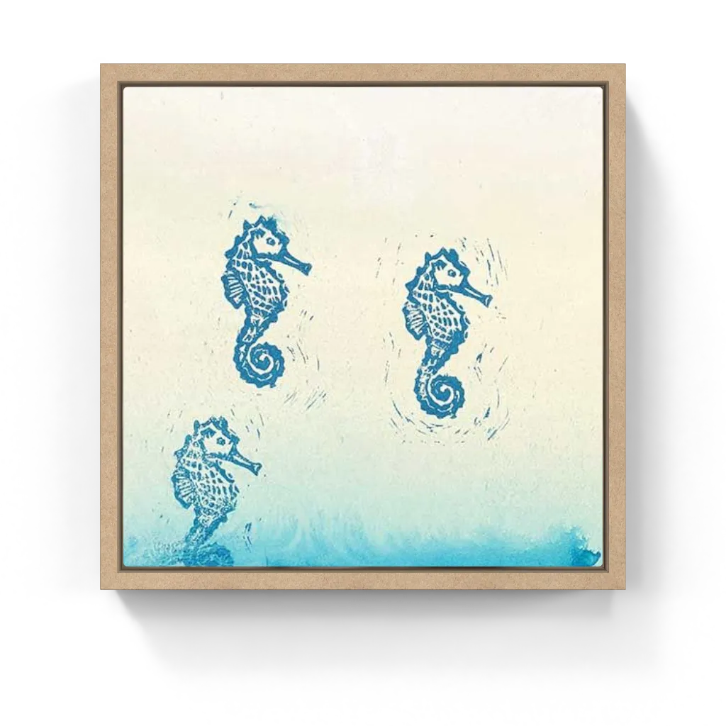 Four seahorses swim gracefully across a watercolor wash of blues and soft neutrals. The delicate print style captures the elegance of the sea, evoking a serene and calming ocean vibe.