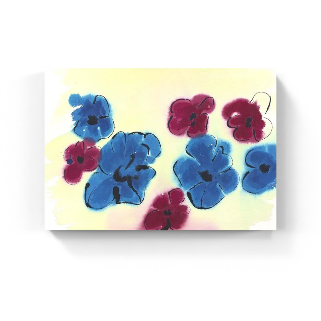 Vibrant watercolor artwork featuring abstract blue and magenta blossoms with playful ink outlines. Modern floral abstraction with fresh, spontaneous style.