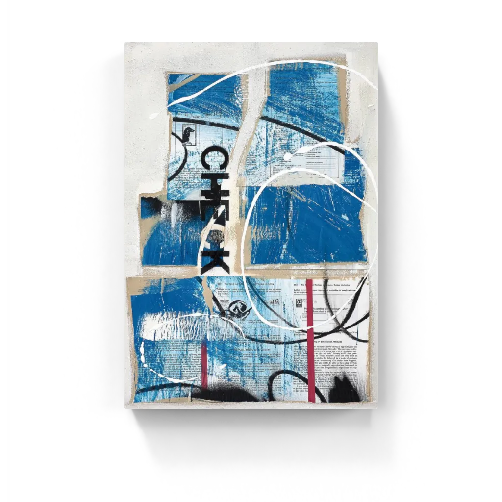 "Subjective Collective V" blends mixed-media collage with expressive abstraction. Rich layers of text, vibrant blues, bold typography, and dramatic paint splashes merge to create an energetic contemporary composition.