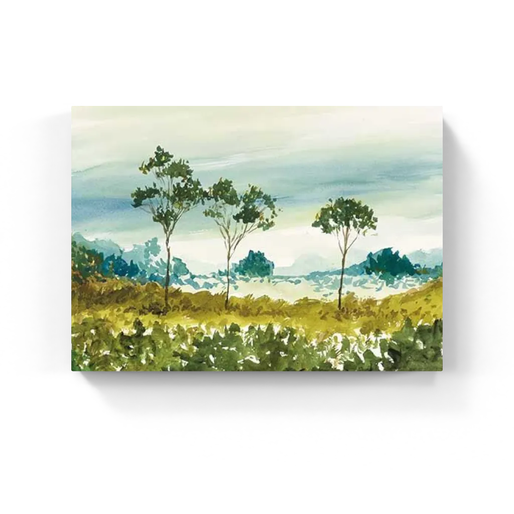 Loose brushstrokes of green and gold shape a peaceful countryside—three slender trees rise against a misty horizon in this fresh, impressionistic watercolor.