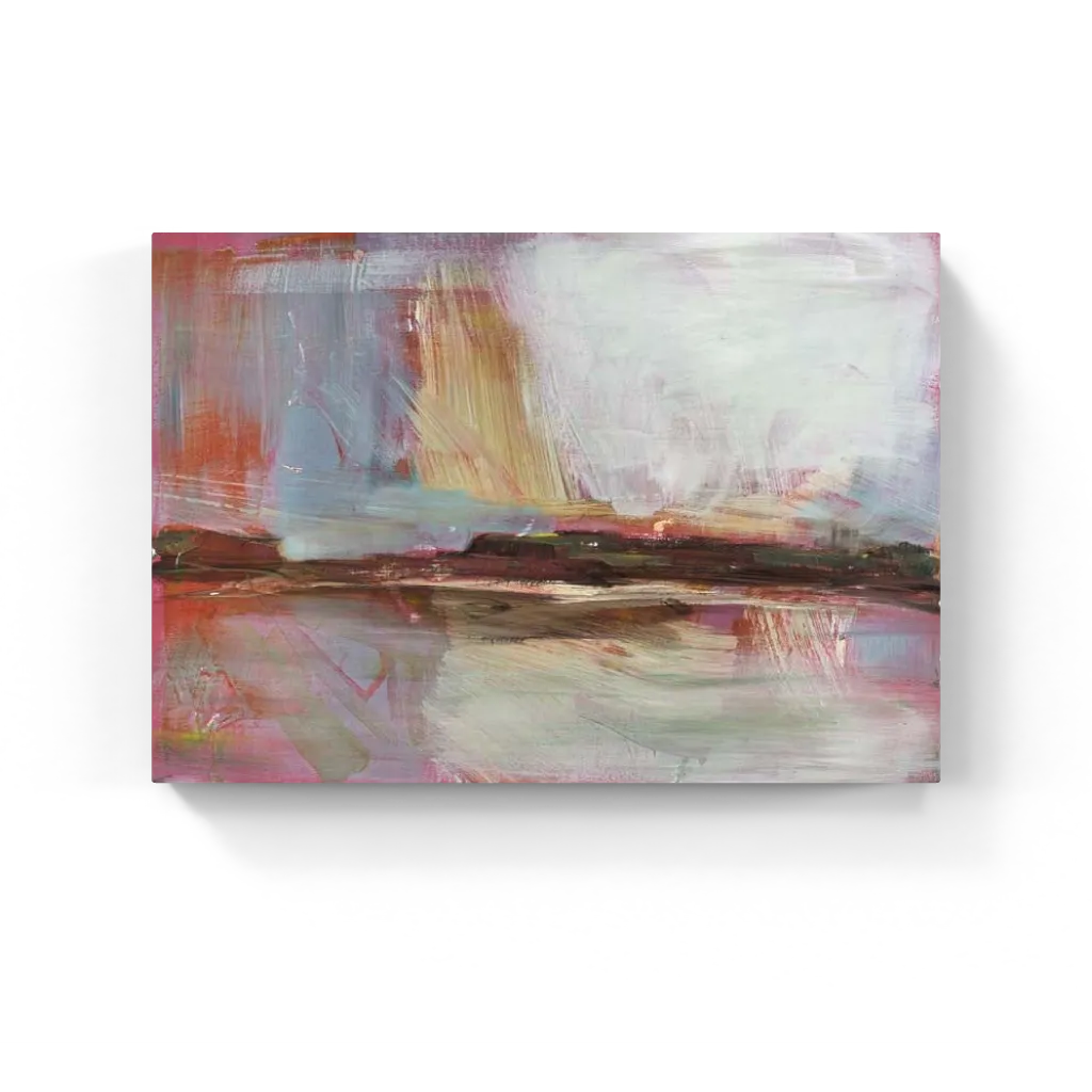 Abstract landscape painting characterized by expressive brushstrokes in shades of muted blues, warm earth tones, and soft pinks, suggesting a serene horizon and reflective waters with an impressionistic sense of light and space.