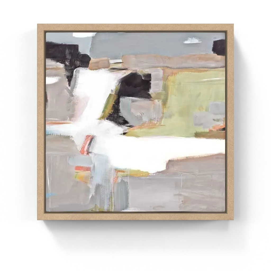 Softly deconstructed and serene, this abstract landscape layers cool grays, muted greens, and sandy neutrals—suggesting terrain, memory, and erosion in a dreamlike, vaporous space.