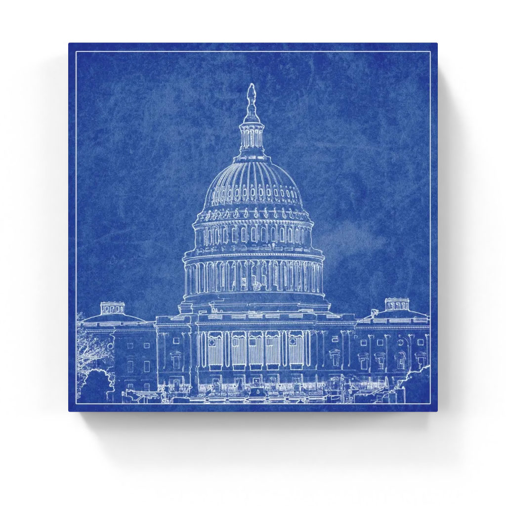 This vintage style blueprint illustration displays the beauty of the United States Capitol Building. Rendered with fine detail, the iconic dome rises up against a richly textured blue background, blending history with artistry. Perfect for architecture enthusiasts, design forward spaces, or collectors of Americana. This artwork brings classic sophistication and cultural depth to contemporary interiors.