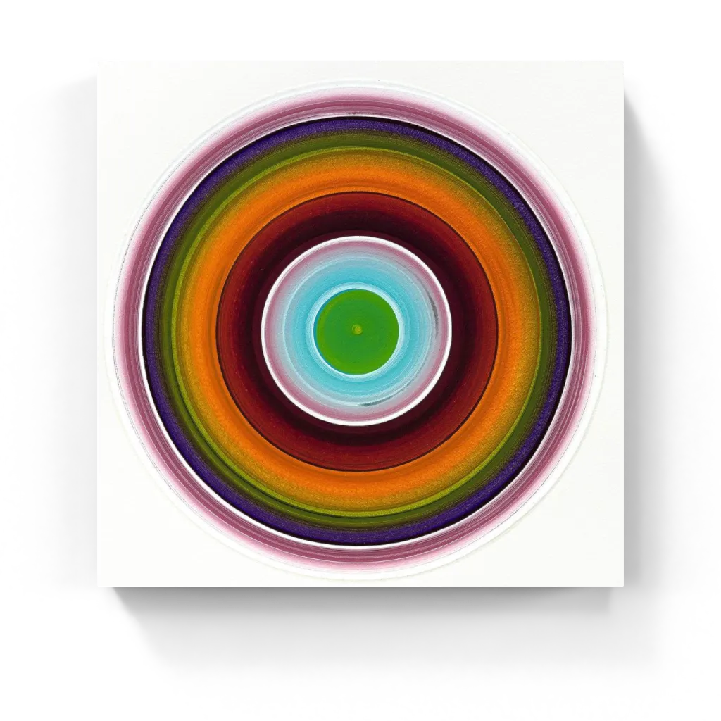 Vibrant abstract painting featuring bold concentric circles in turquoise, yellow, orange, and green, creating an energetic vortex effect.