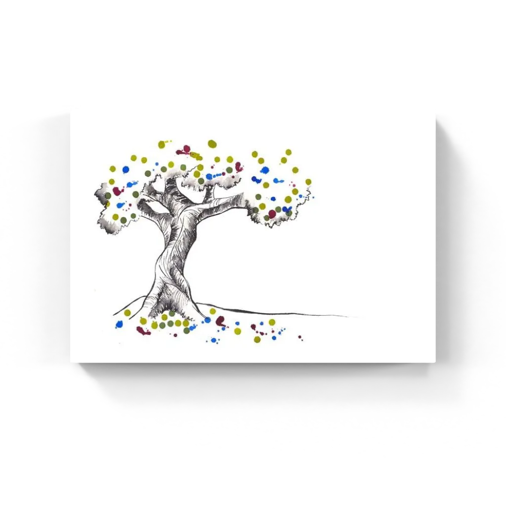 Simple multimedia image of a tree with pops of color. This piece has a mate, Hardwoon Spring II.