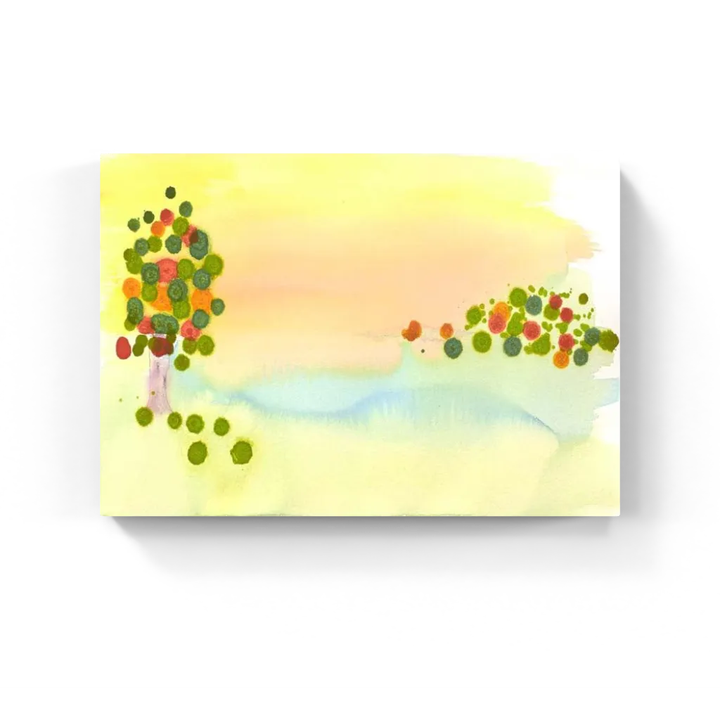 A dreamy lakeside glows in pastel hues as a whimsical tree bursts with multicolored orbs—like blossoms or fruit—scattered across the soft landscape. Light, airy, and joyfully surreal.