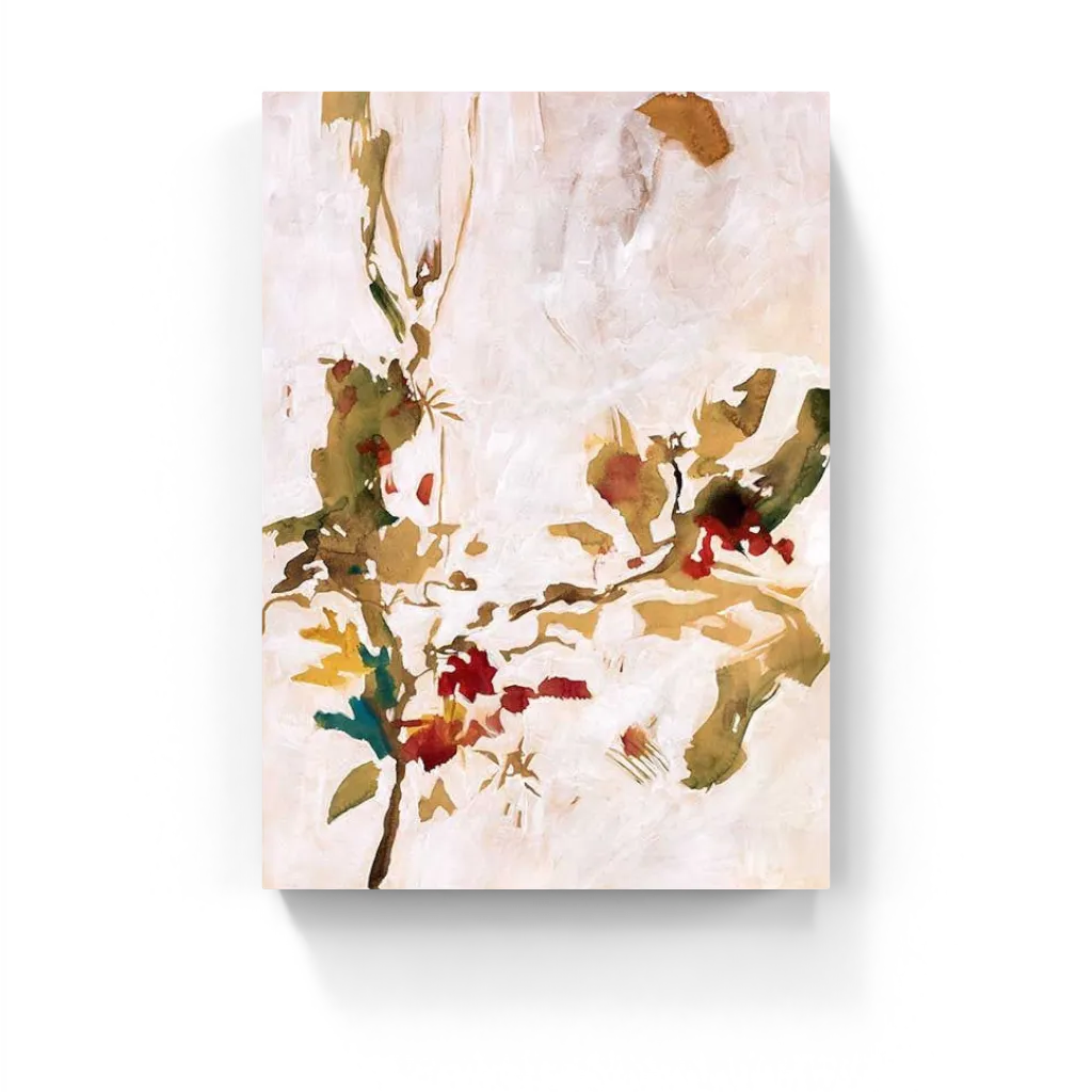 An intricate abstract artwork featuring vibrant silhouettes of birds and foliage intertwined against a textured white background, conveying harmony and movement.