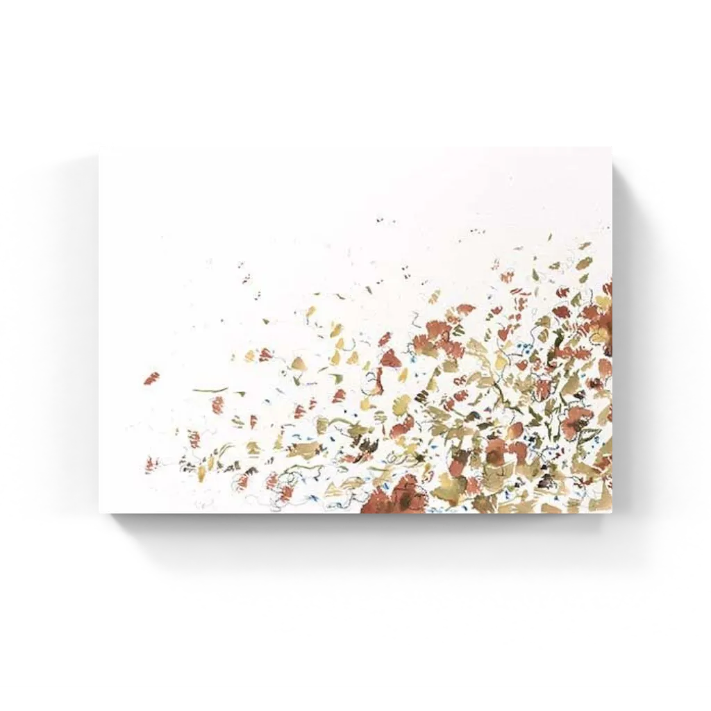 Delicate bursts of rust, ochre, and blue drift across a white expanse—like windblown petals frozen mid-flight. Stillness speaks in this lyrical abstraction.