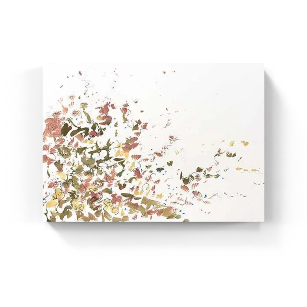 Delicate bursts of rust, ochre, and blue drift across a white expanse—like windblown petals frozen mid-flight. Stillness speaks in this lyrical abstraction.