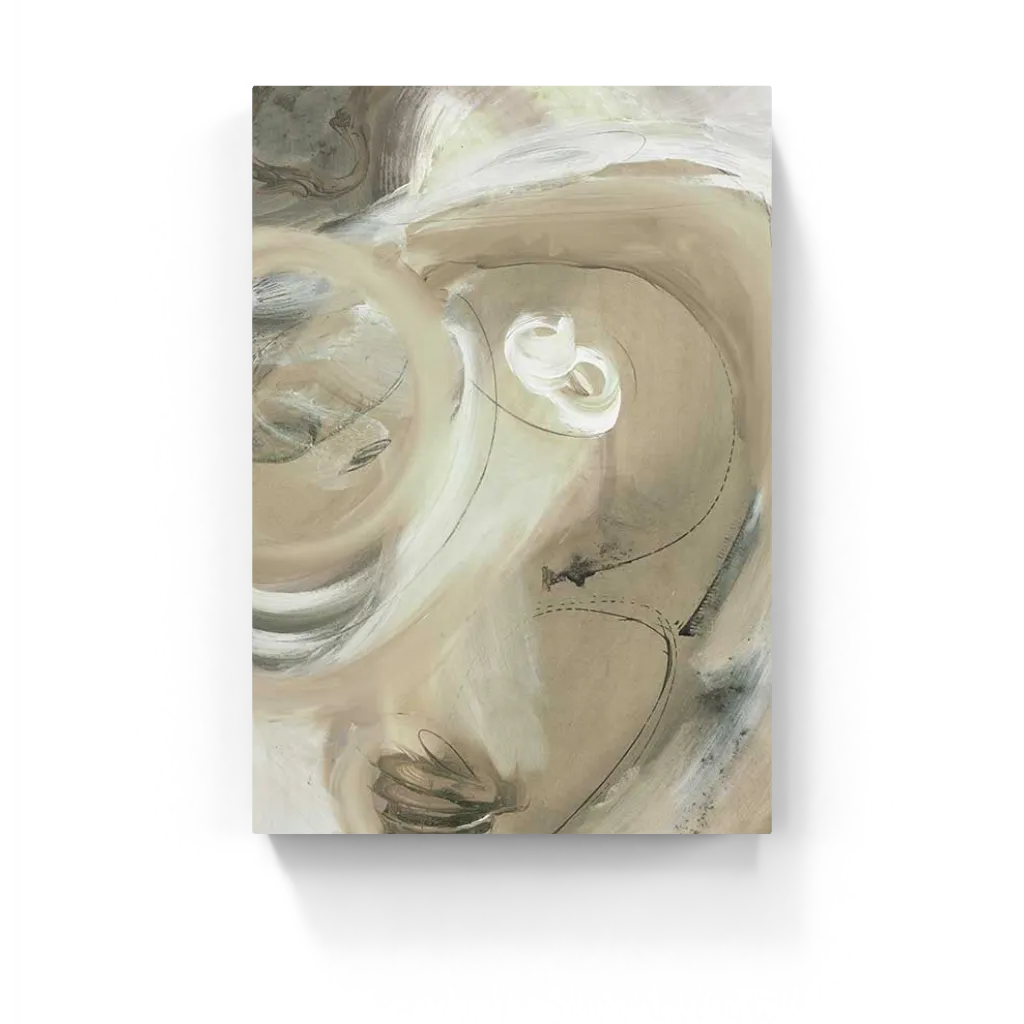 Soft, swirling gestures in warm taupe tones flow across the canvas—layered brushstrokes and circular forms evoke grounded movement and subtle emotional resonance.