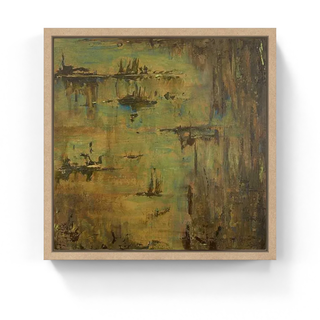 “The Explorer’s Chronicle I” evokes a mysterious terrain—earthy greens and browns layered with glimmers of blue, as if charting a forgotten landscape or dreamt expedition.
