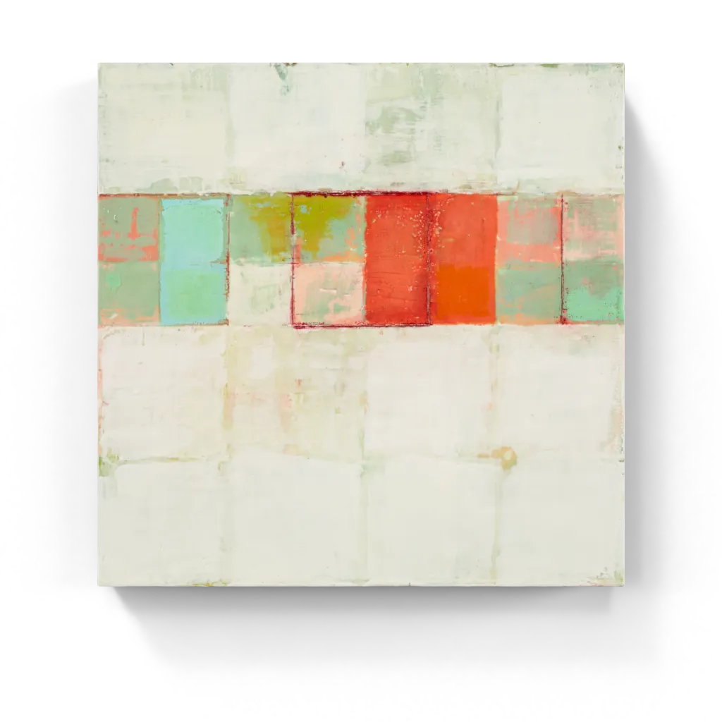 Outside The Box features a grid-like structure of muted blocks with pops of red and green, symbolizing freedom within form. This modern abstract suits contemporary interiors, creative offices, or anyone looking to add artistic order.