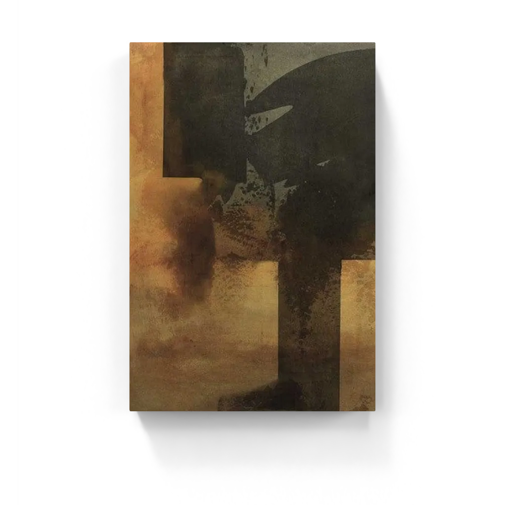 Oxidized Harmony I is a raw abstract piece featuring a bold black slab framed by scorched sienna and muted ochre. Minimalist, textured, and industrial—where decay meets design.