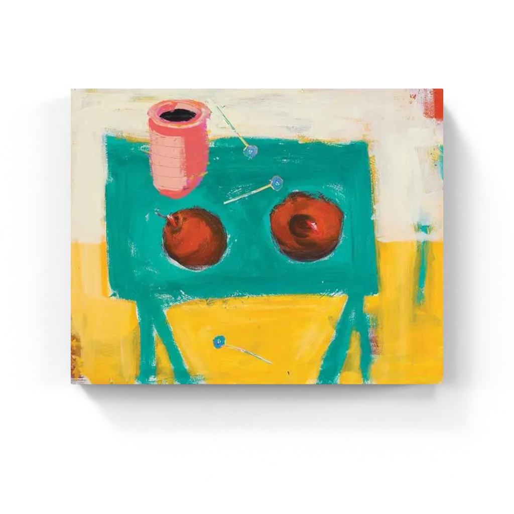 A bold, abstract still life featuring vibrant turquoise, yellow, and red hues. The playful arrangement of a pink vase, apples, and flower pins creates a quirky and energetic composition.