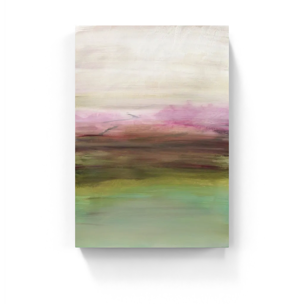 Soft washes of green, rose, and gold blend into a dreamy abstract horizon. Light, layered, and serene, this piece evokes fields at dusk or memory in motion.