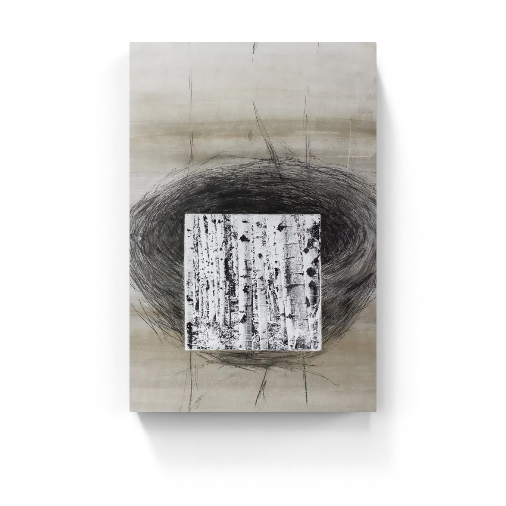 This contemplative mixed-media artwork features a softly rendered birch tree layered with a delicate drawing of a bird’s nest. With a muted palette and refined texture, the composition evokes a quiet sense of grounding, nature, and memory. Designed with a minimalist touch, it’s an ideal addition for serene, biophilic interiors seeking emotional nuance and visual stillness.