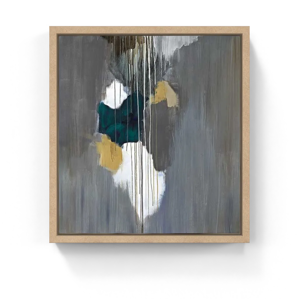 Chimera III is a moody abstract painting that explores form, depth, and fluidity. Deep emerald, soft ochre, and luminous white shapes surface through washes of gray drips. It creates a layered composition that feels both enigmatic and atmospheric. Quiet yet dramatic, this contemporary artwork offers sophisticated intrigue and visual tension. Perfect for modern interiors that embrace bold artistic expression.