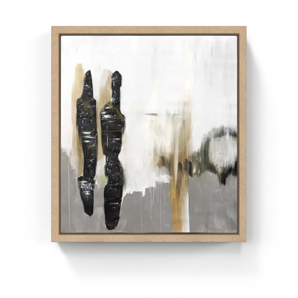 Two dark, textured forms stand side by side—silent, monolithic, and slightly distorted—framed by soft smears of white, gray, and ochre. The scene holds a quiet tension, hovering between presence and absence. This dark textured forms abstract artwork brings subtle drama, meditative stillness, and modern minimalism to any interior.