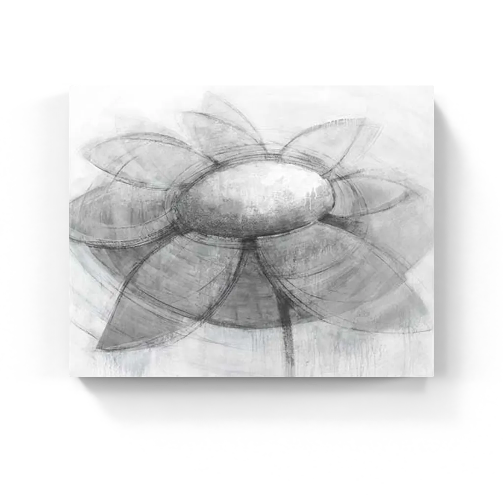 A luminous bloom unfolds in graphite and mist—petals arc gently around a glowing center, sketched with layered softness and quiet gravity.