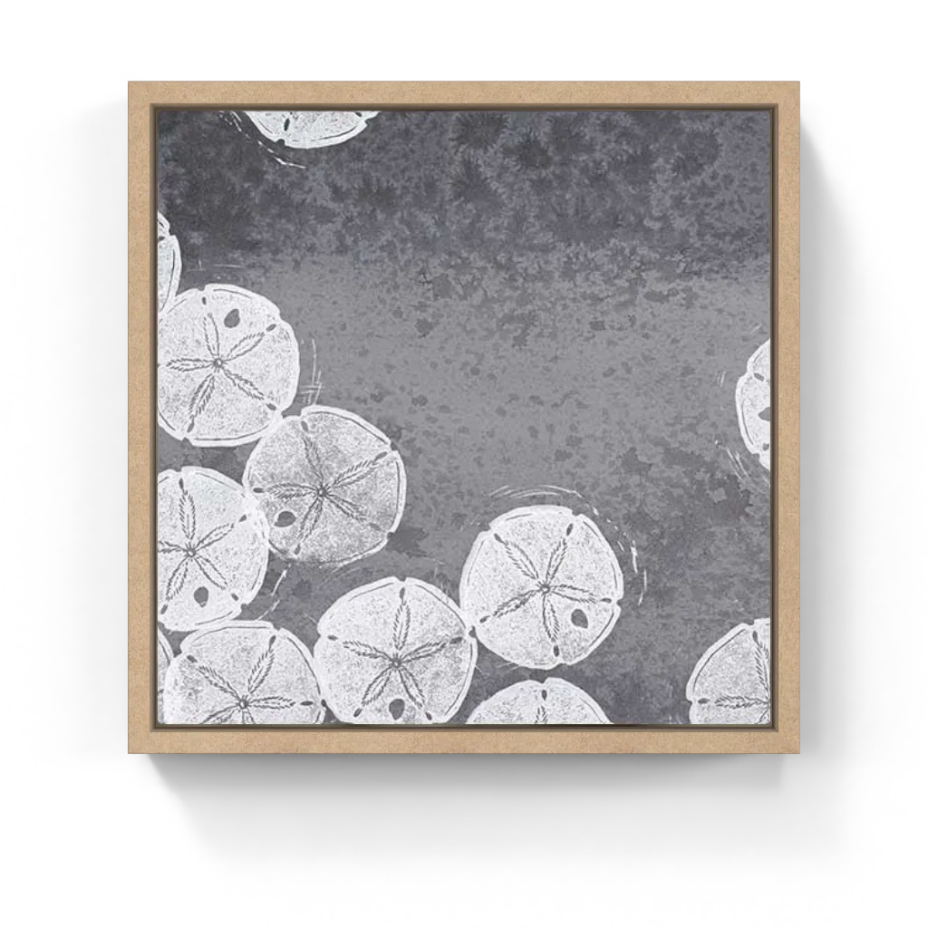 Delicate white impressions of sand dollars float against a textured gray backdrop—like fossils suspended in time or gentle echoes on the ocean floor. Subtle, serene, and meditative.